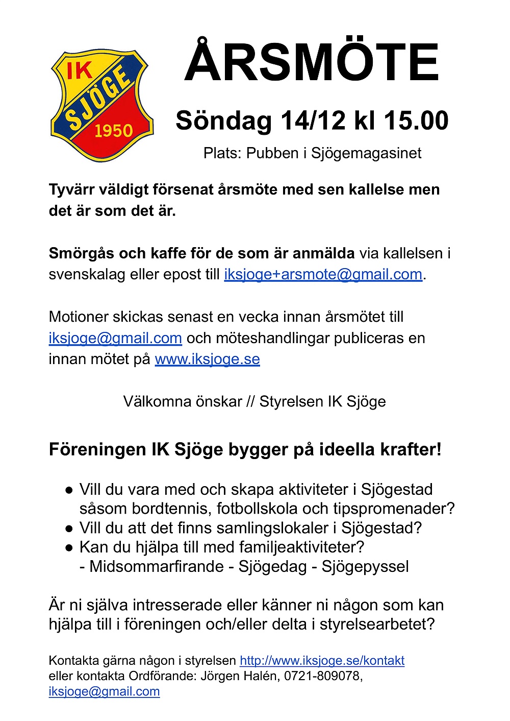 Smörgås och kaffe för de som är anmälda via kallelsen i svenskalag eller epost till iksjoge+arsmote@gmail.com.